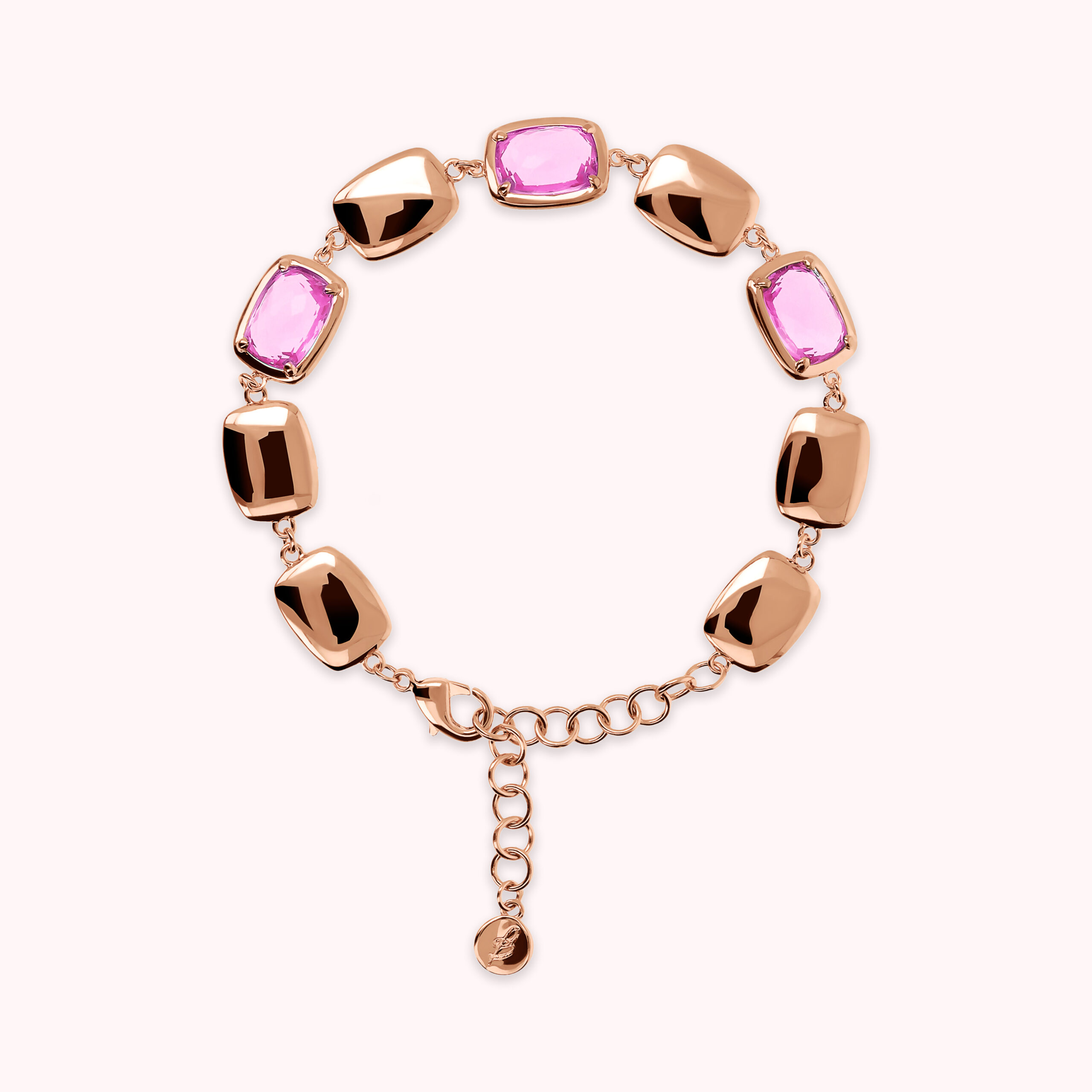 È realizzato in lega golden trattamento placcato oro rosa, con chiusura moschettone, con prisma gem in colore rosa.