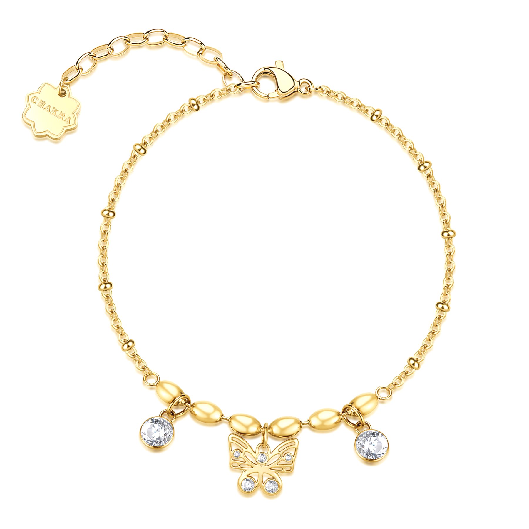 È realizzato in acciaio trattamento placcato oro giallo, con chiusura moschettone, con simbolo farfalla, con zircone in colore bianco, con significato cambiamento | rinascita | serenitÀ la simbologia legata a questo meraviglioso insetto rimanda all’idea di trasformazione spirituale e rinascita: il perfetto portafortuna per chi sta vivendo un profondo cambiamento personale e per uscirne più forte e sereno..