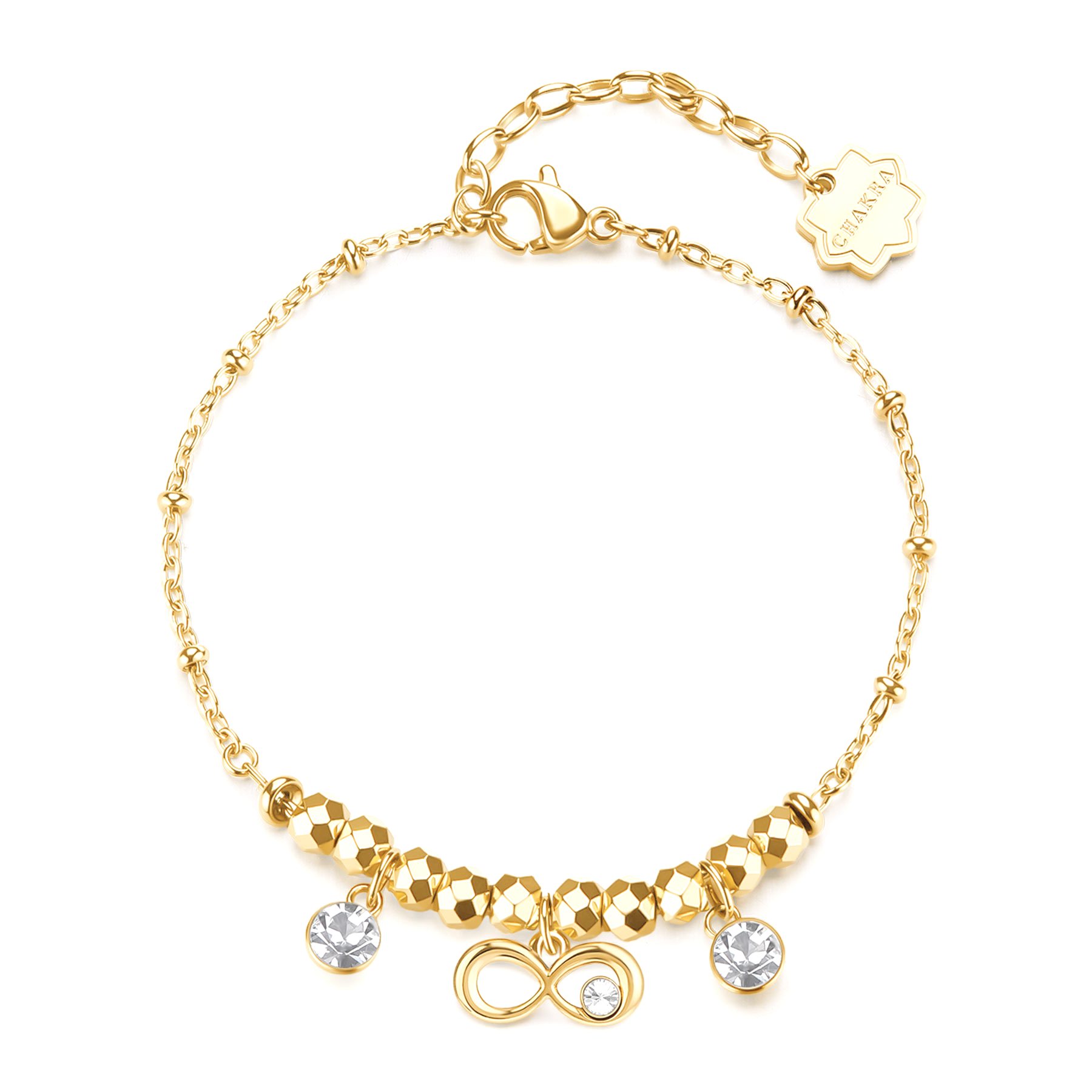 È realizzato in acciaio trattamento placcato oro giallo, con chiusura moschettone, con simbolo infinito, con zircone in colore bianco, con significato vita | libertÀ | energia l’infinito è simbolo di perfezione | due cerchi interconnessi che indicano l’assenza di limiti e le diverse possibilità che si hanno nella vita. un otto sdraiato associato all’energia femminile che dà la forza di raggiungere gli obiettivi prefissati..