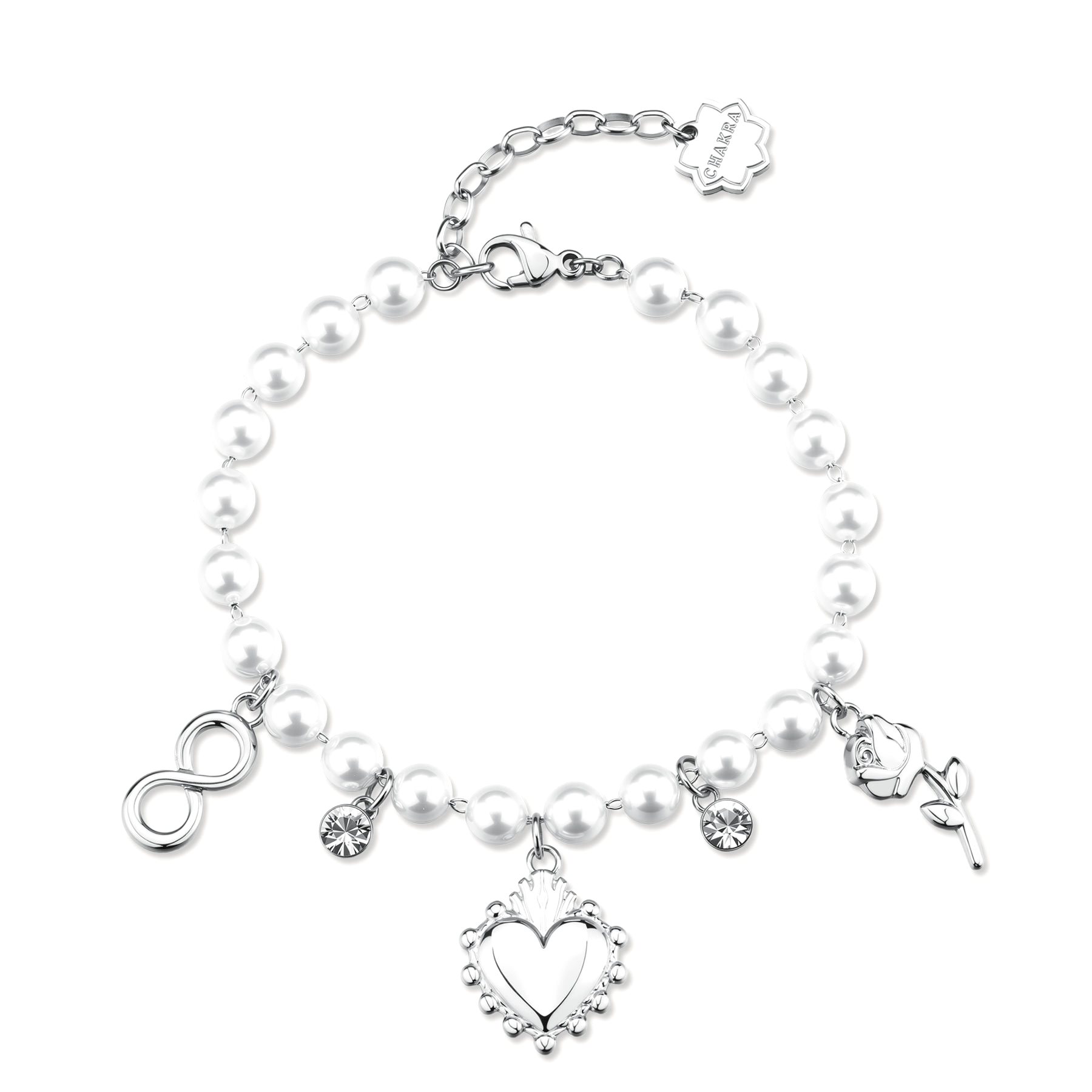 È realizzato in acciaio con chiusura moschettone, con simbolo cuore sacro, infinito e rosa.