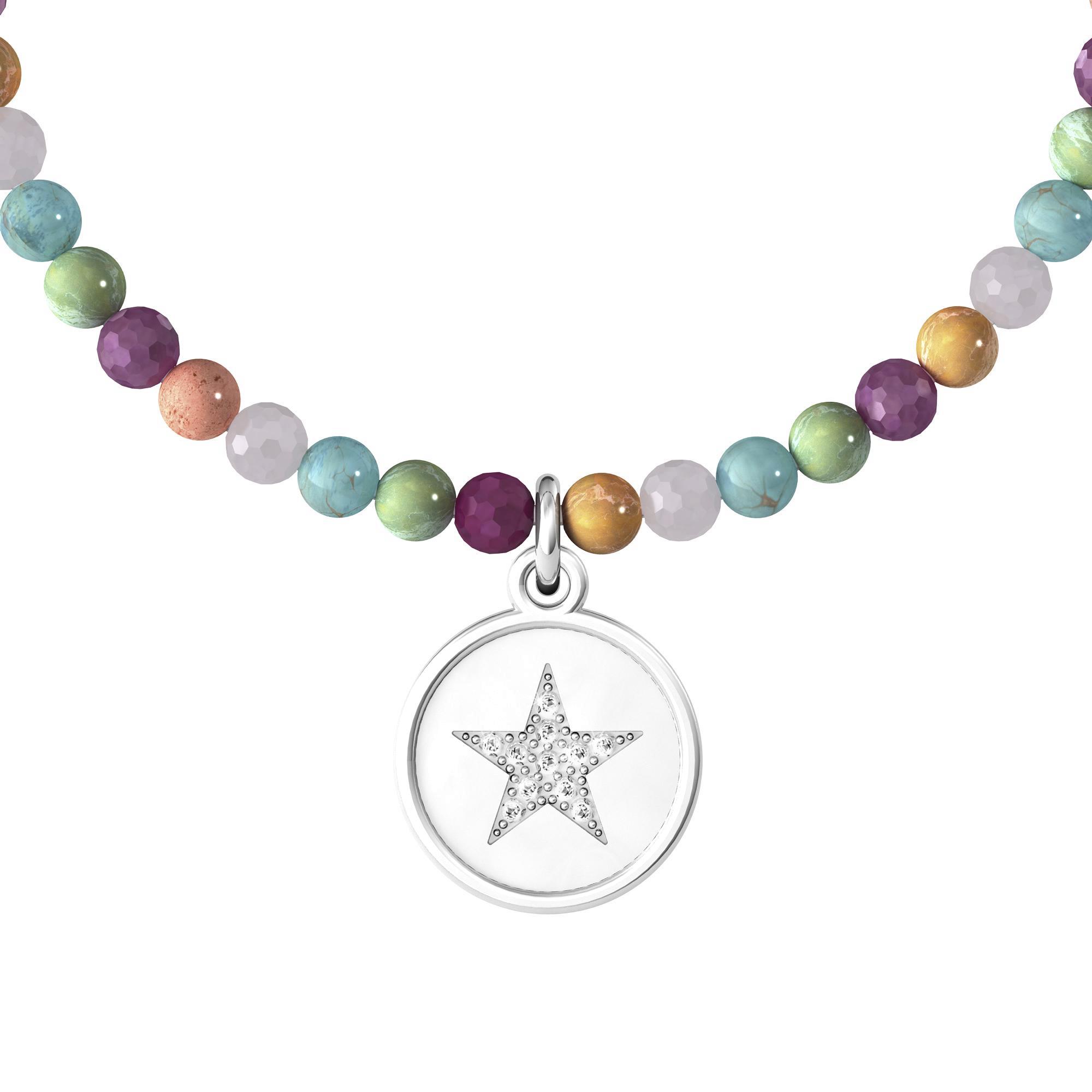 È realizzato in acciaio trattamento satinato e lucido, con simbolo stella, con cristallo e pietra naturale in colore bianco e multicolor.