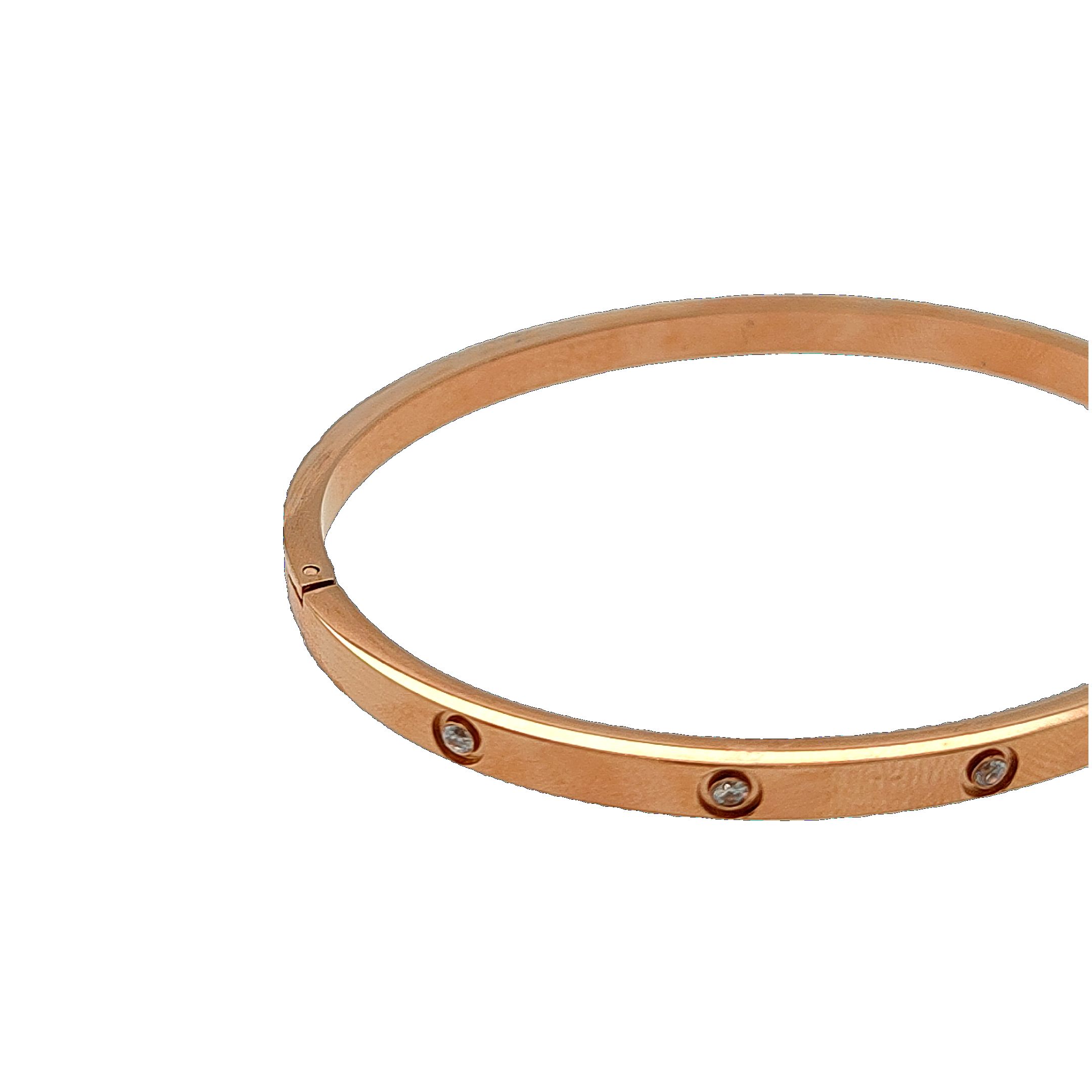È realizzato in acciaio trattamento placcato oro rosa, con chiusura a scatto, con zircone in colore bianco.