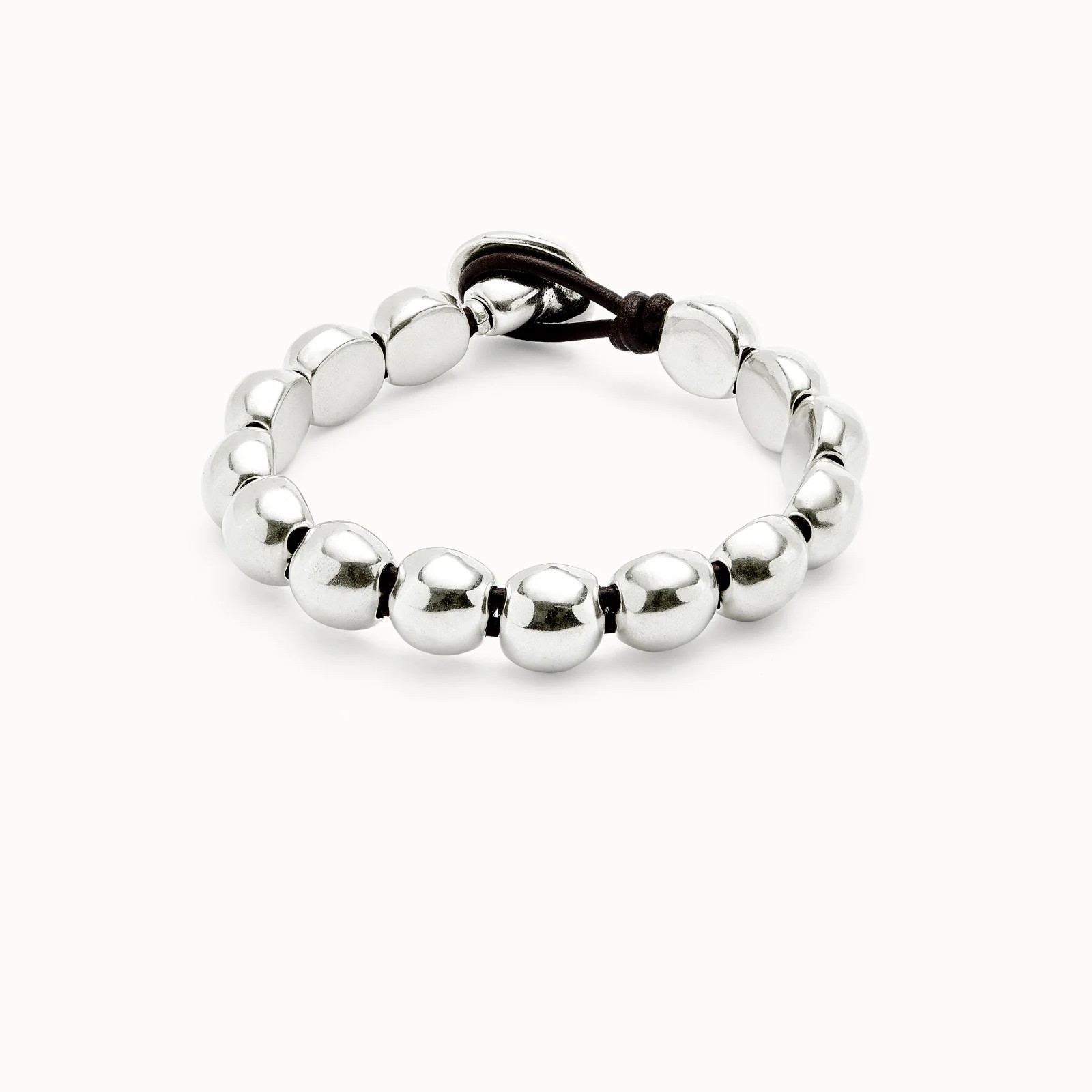 È realizzato in argento sterling 925 e cuoio con chiusura bottone.