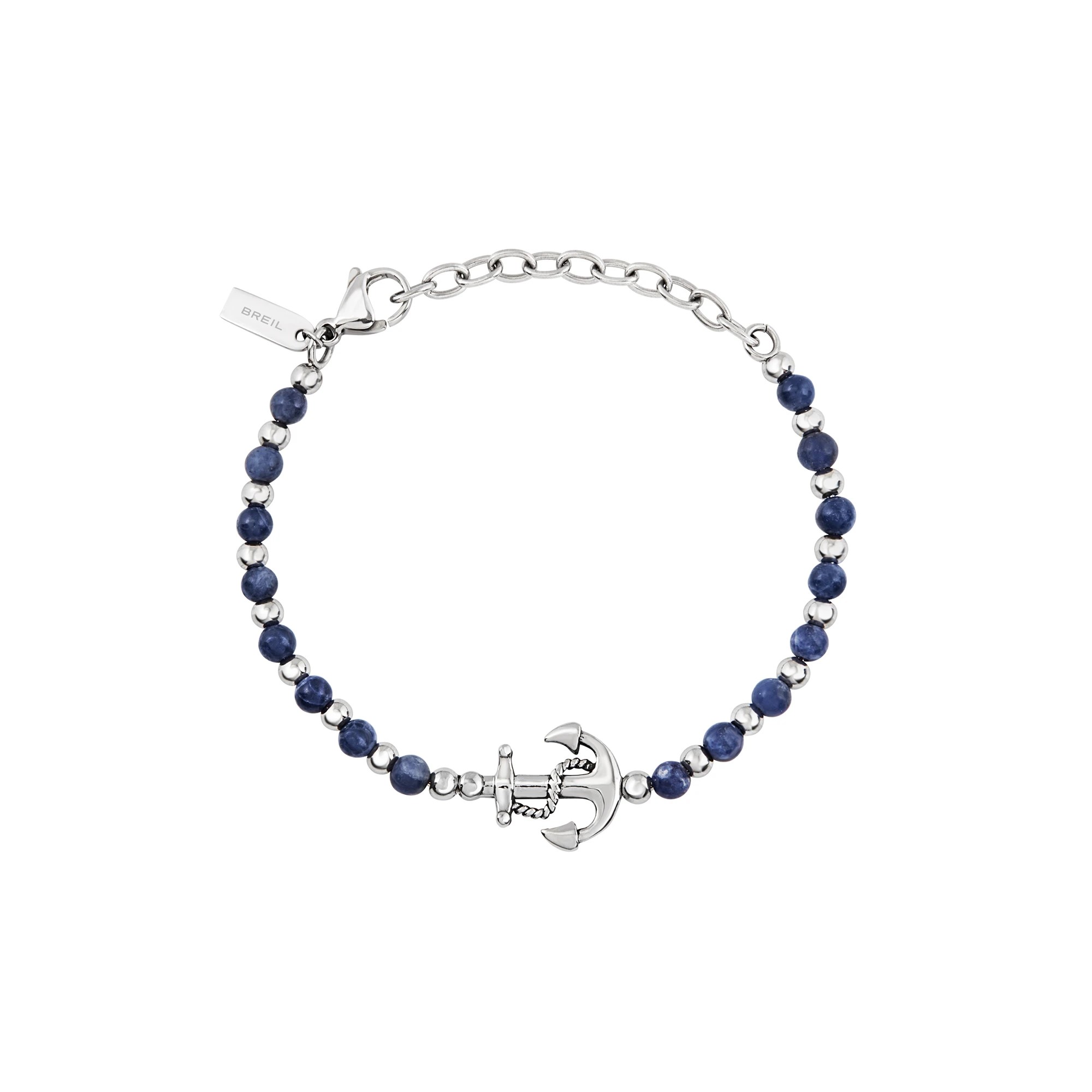 È realizzato in acciaio trattamento specchiato, con simbolo ancora, con sodalite in colore blu.