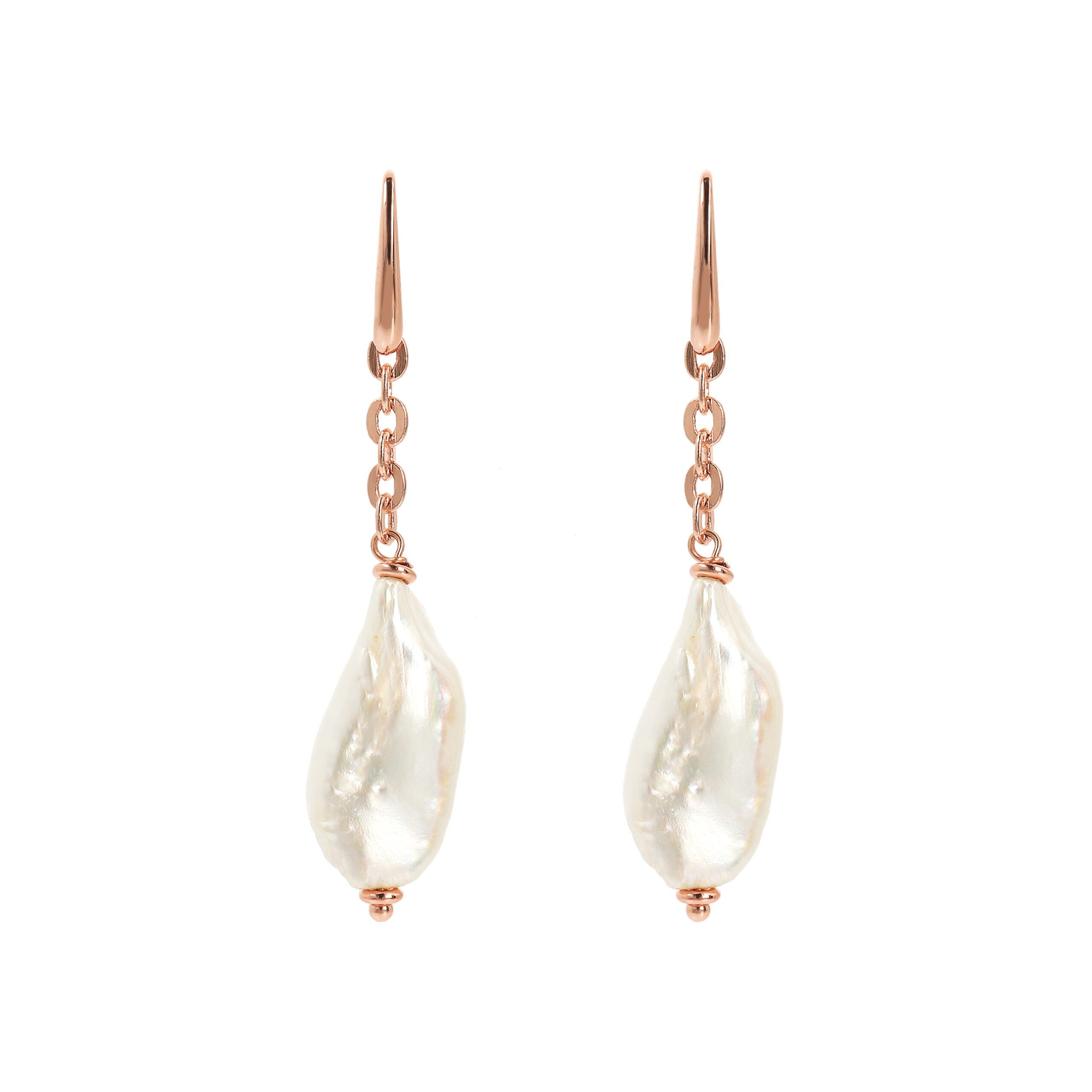 È realizzato in bronzo e lega trattamento placcato oro rosa 18k, con chiusura a monachella, con perla barocca in colore bianco.